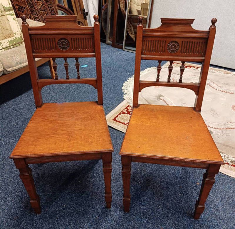 Pair of 19th century oak hall chairs with carved decoration & panel seats on squared tapered supports