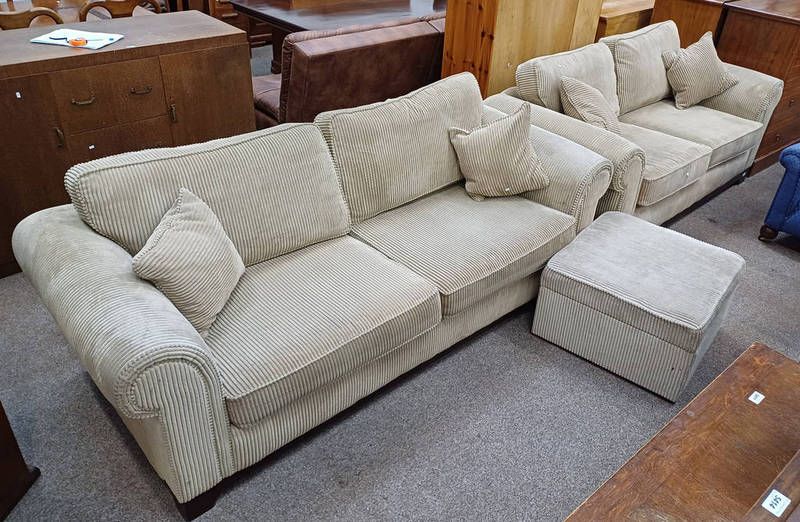 Set of 2 corded fabric overstuffed settees & matching footstool