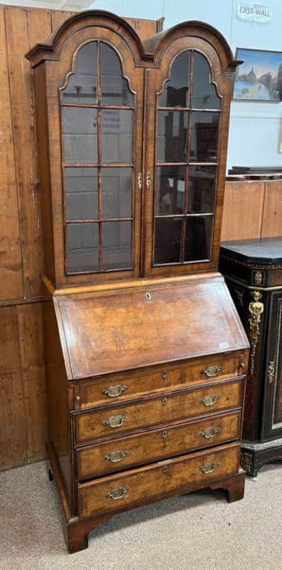 18th century style walnut bureau bookcase with arched top over fall front desk with fitted interior, cross banded & inlaid decoration over 4 graduated drawers on bracket supports - 198 cm tall
