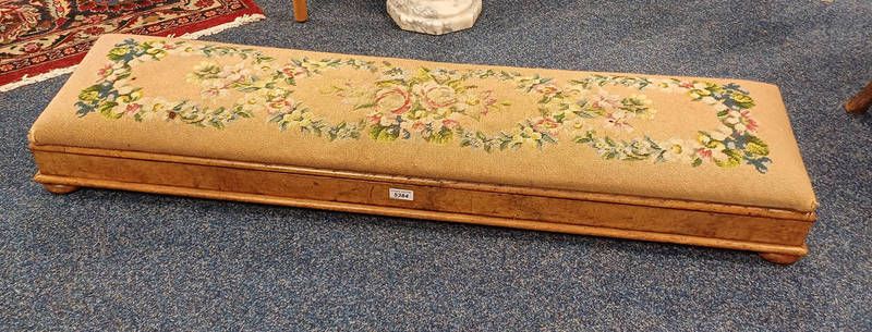 19th century walnut footstool with lift-up floral tapestry paded top on bun feet
