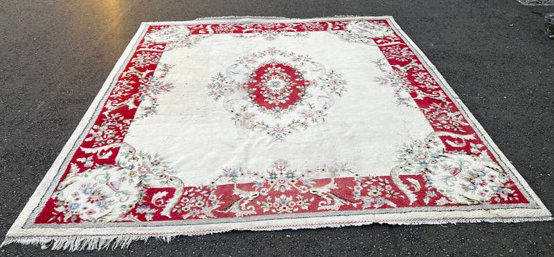 Large oriental floral decorated carpet with frilled ends, 380 x 360cm