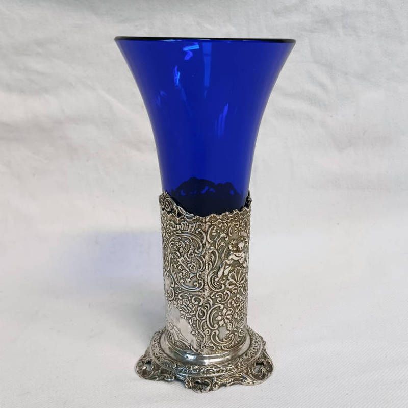 Victorian silver & blue glass tapering vase decorated with cherubs & musical instruments with import marks for london 1894 - 18cm tall, 95g weighable silver