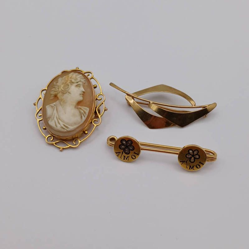 9ct gold brooch, 19th century gold, enamel & rose-cut diamond brooch & 9ct gold cameo brooch - 13.0 g