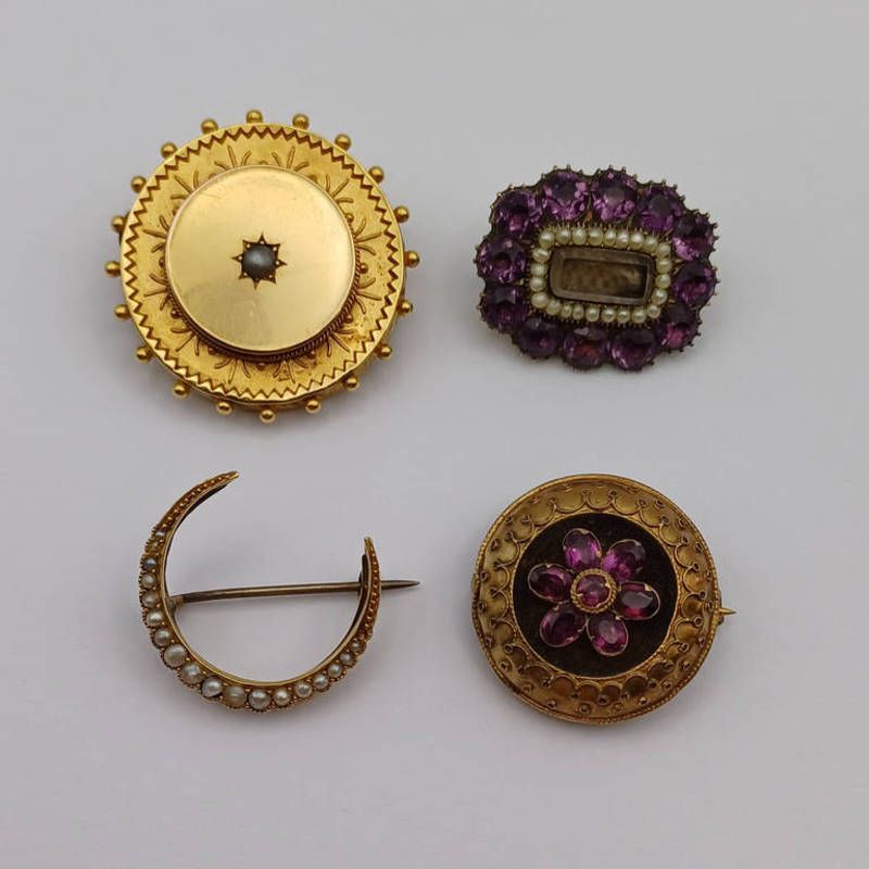 19th century gold pearl set circular brooch, gold seed pearl crescent brooch & 2 victorian memoriam brooches - 20g total