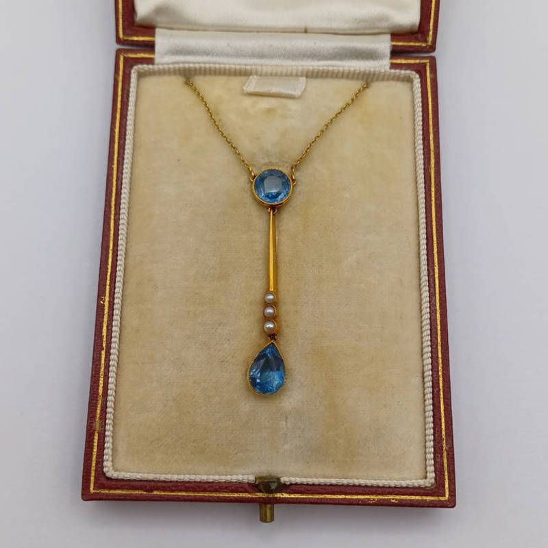 Early 20th century 15ct gold aquamarine & seed pearl negligee pendant, a circular cut aquamarine on a fine chain with a trio seed pearls & pear shaped aquamarine suspended below - 41 cm long, 2.8 g