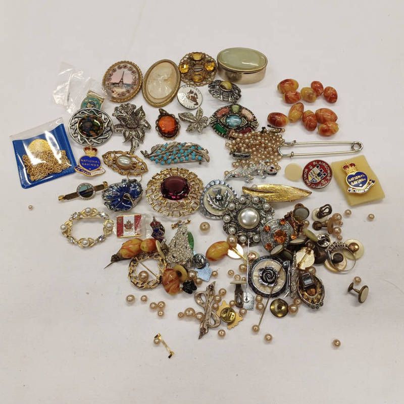 Selection of various jewellery including rings, brooches, enamel badges, etc