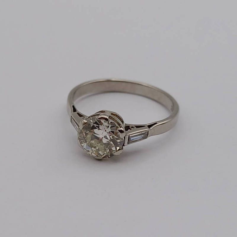 An art deco style platinum set diamond single stone ring, the old circular cut diamond approx 1.45 carats, flanked by 2 baguette cut diamonds - ring size o