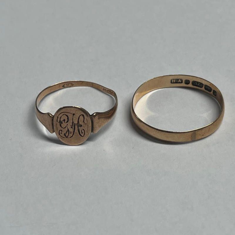 9ct gold wedding band & 9ct gold signet ring - 2.5g total, both as found