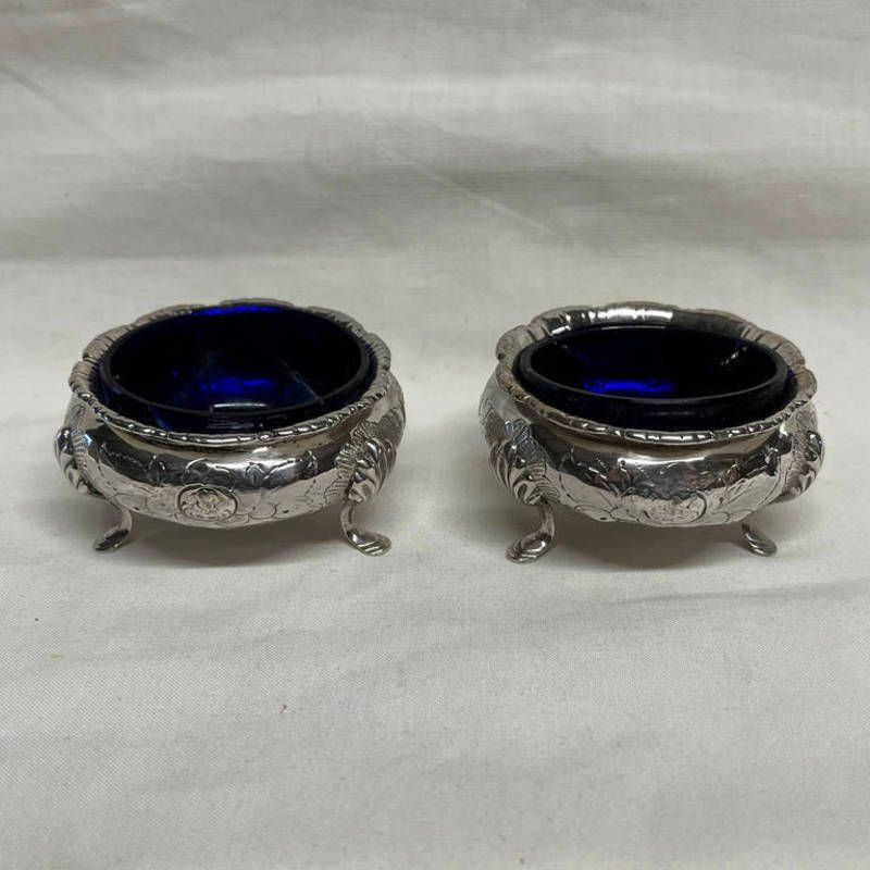 Pair of victorian silver circular salts with foliate embossed decoration by mappin bros, london 1874 - 115g. one liner smashed
