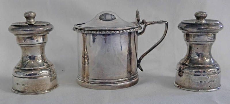 Silver drum mustard pot, london 1963 & pair of silver pepper mills, london 1910 - 110g weighable silver