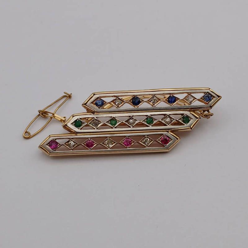 9ct gold multi-gem set brooch, set with emerald, sapphires, rubies & diamonds - 5cm long, 10.0 g