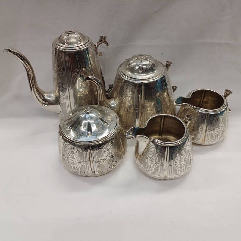 19th century 5 piece french silver tea service with engraved decoration - distressed, 2100g