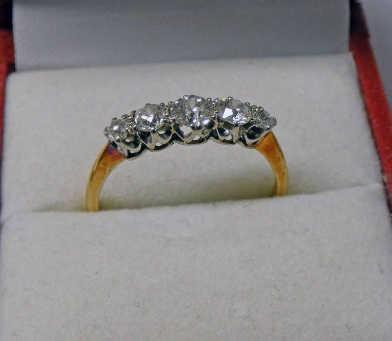 Diamond set 5 stone ring in setting marked 18ct, approx. 0.6 carats, ring size q