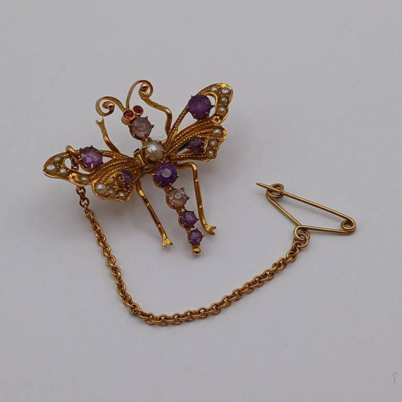 Gold seed pearl, amethyst & gem set insect brooch - 3.5cm wide, - 3.7 g