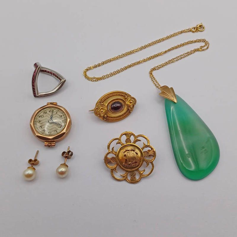 9ct gold ladies wristwatch, 19th century gold garnet cabochon set brooch - a/f, pair of 9ct gold pearl set ear studs, 9ct gold mounted green hard stone pendant on chain, gem set wishbone ring, etc.
