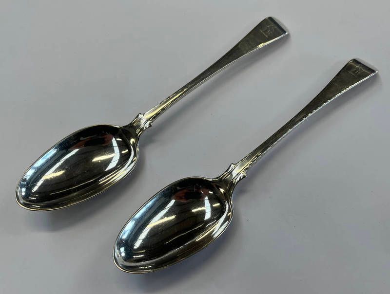 Pair of george iii silver feather edge tablespoons by thomas dane, london 1769 - 145g