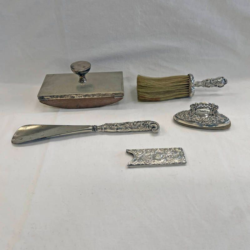 Silver desk blotter with engine turned decoration, birmingham 1930, silver handled table brush, silver handled nail buff & shoe horn, etc