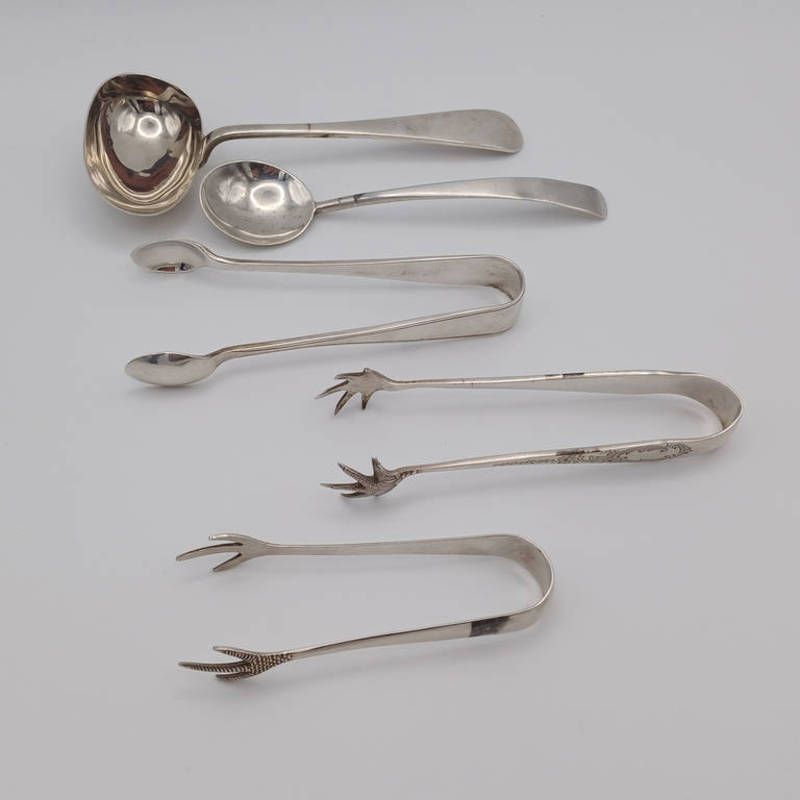 Silver ladle, silver caddy spoon, pair of silver sugar nips, etc - 150 g weighable...