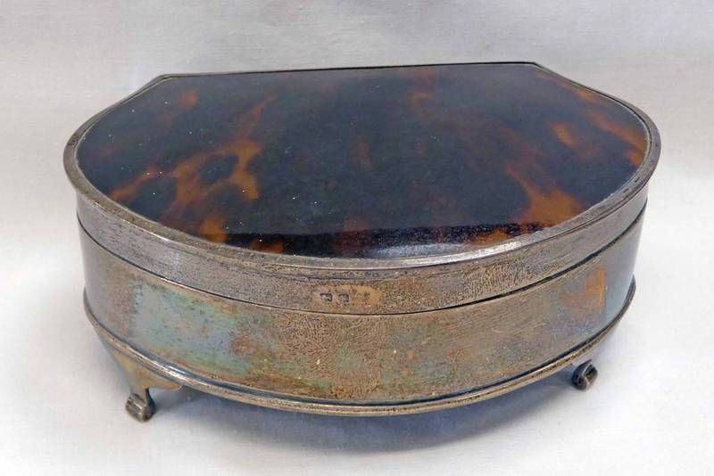 Silver & tortoiseshell kidney shaped jewellery box with pique work decoration to lid on 4...