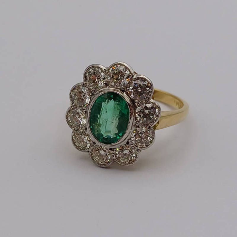 18ct gold & platinum emerald & diamond cluster ring, the oval emerald set within a surround of brilliant cut diamonds approx 1.6 carats in total - ring size o