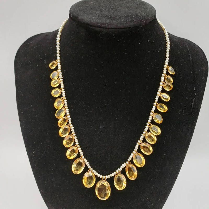Early 20th century seed pearl & faceted oval citrine fringe necklace with a 9ct gold barrel clasp - 40cm long