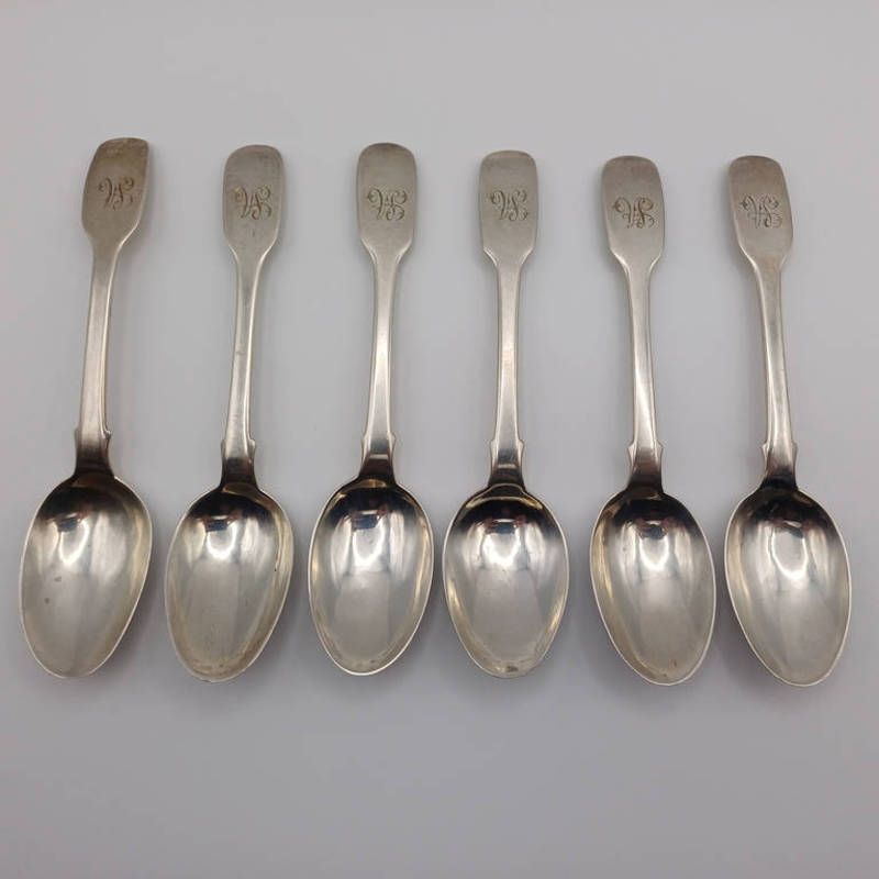Set of 6 silver fiddle pattern teaspoons by james barber & william north, york 1838, 120g