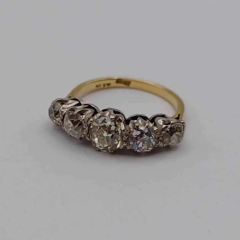 18ct gold & platinum 5-stone diamond set ring, the graduated cushion shaped diamonds very approx 3.2 carats - ring size o 1/2