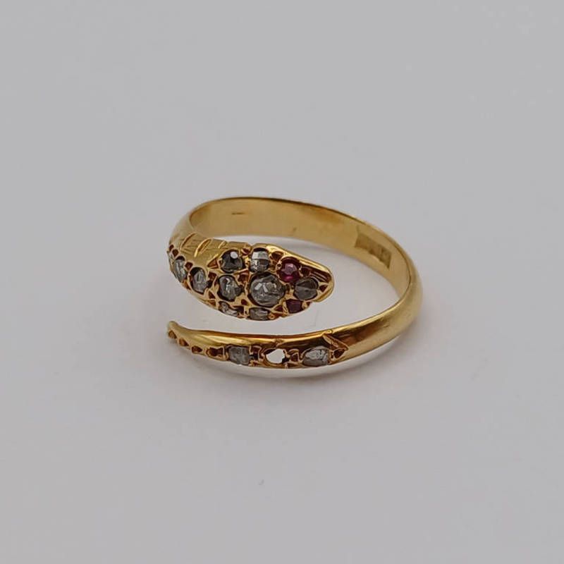 Egyptian 18ct gold ruby & diamond snake ring - 2.7 g, ring size j, 1 diamond deficient