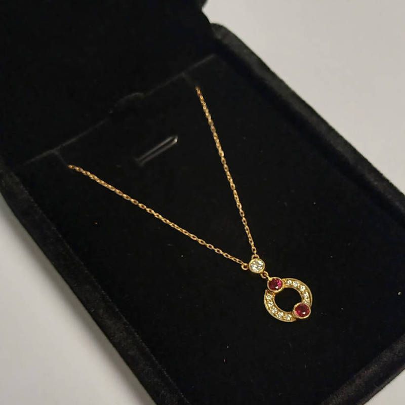 18ct gold ruby & diamond circular pendant suspended from a single diamond on a 9ct gold chain, total weight 2.5g