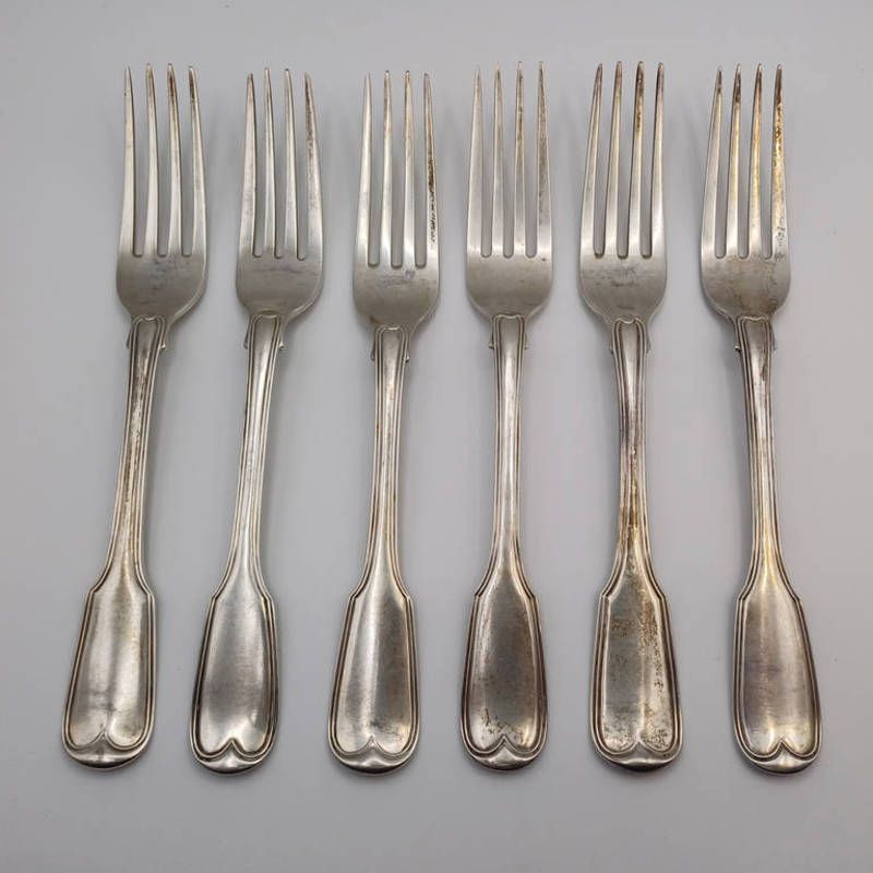 A set of 6 silver fiddle pattern table forks, 3 by charles lias, london 1838 & 3 by william eley i & william fearn, london 1814, 465g