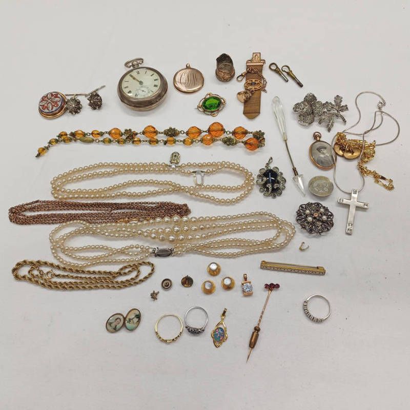 Silver double cased pocket watch, micro mosaic circular brooch, various marcasite & other brooches, etc