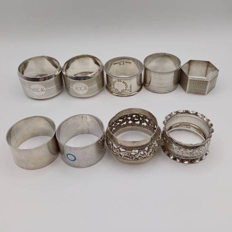 Selection of silver & white metal napkin rings including 4 indian silver exampled by hamilton & company limited, calcutta, 275g total