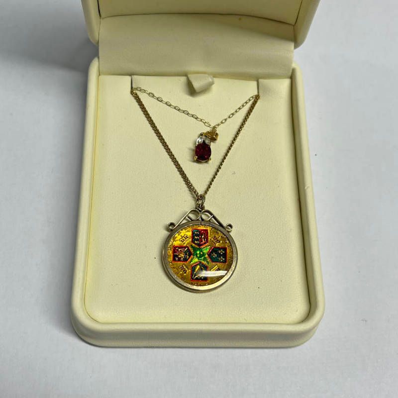 Gem set pendant marked 14k on 9ct gold chain & silver mounted 1797 enamelled six pence in silver gilt mount on 9ct gold chain, weight of chains 3g