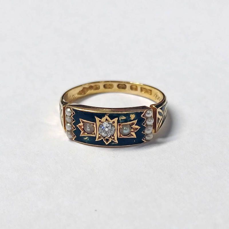 Victorian 18ct gold in memory 3-stone diamond & seed pearl ring dated 1886 - ring size n, 3.2g, ring size o