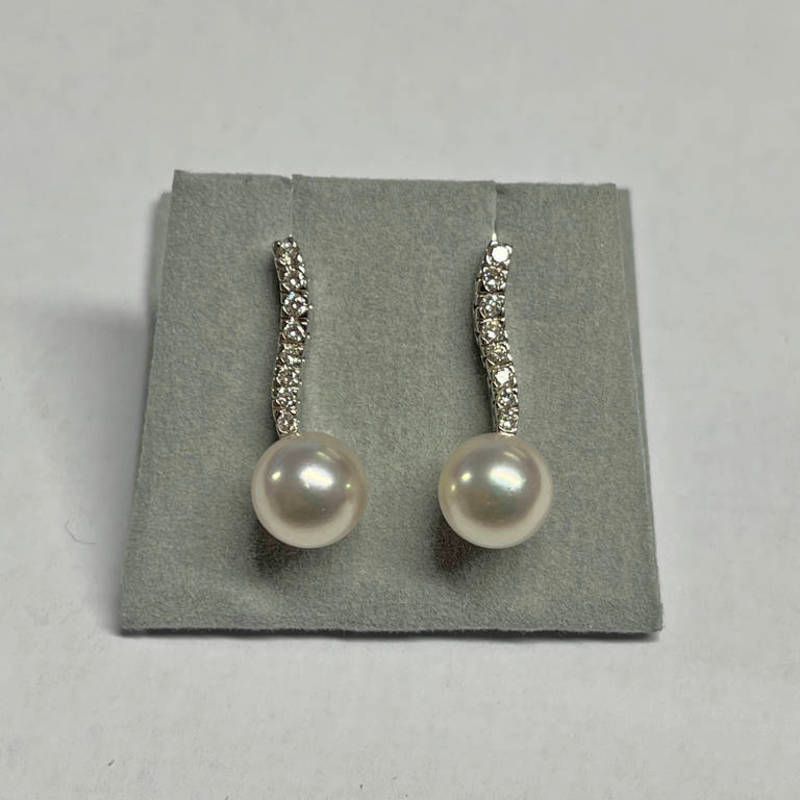 Pair of 18ct white gold cultured pearl & diamond earrings, the cultured pearl suspended on a stem of brilliant cut diamonds - 2 cm long