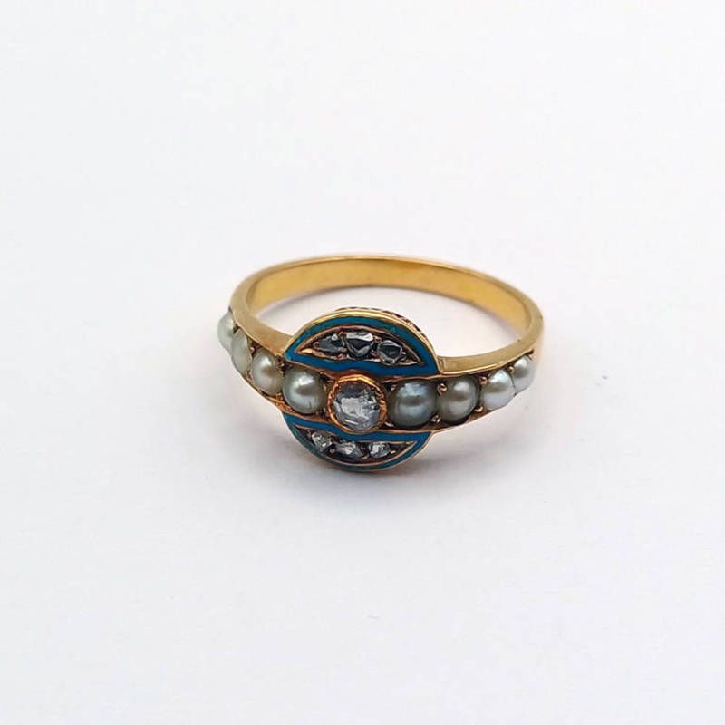 Late 19th century or early 20th century seed pearl, enamel & rose cut diamond ring - 3.7 g, ring size l