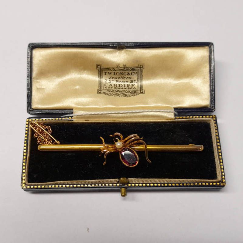 Late 19th or early 20th century 9ct gold pearl & garnet set spider bar brooch by saunders & hollings - 7.5cm long, 6.9g
