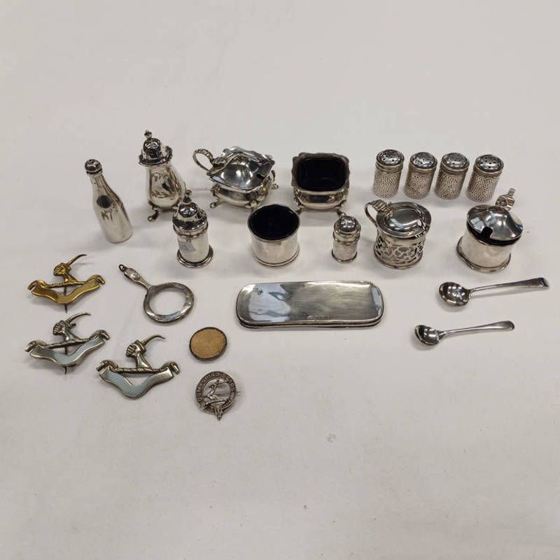 Selection of silver items to include cruet set, set of 4 peppers marked sterling, lid, etc, weighable silver 240g