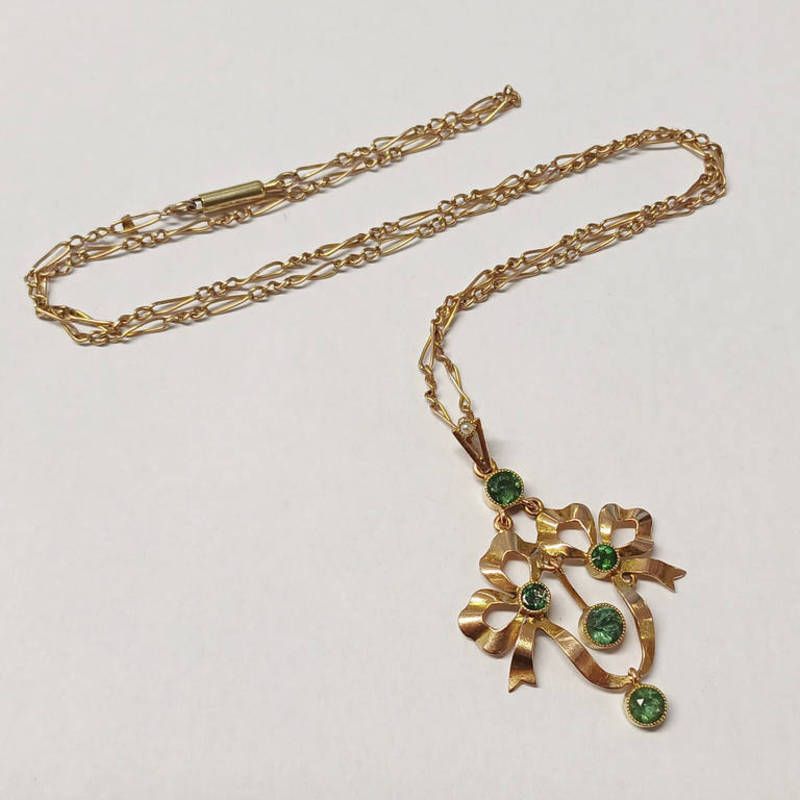 Early 20th century green tourmaline & seed pearl pendant on a 9ct gold chain - 5.3g total, chain 45cm long