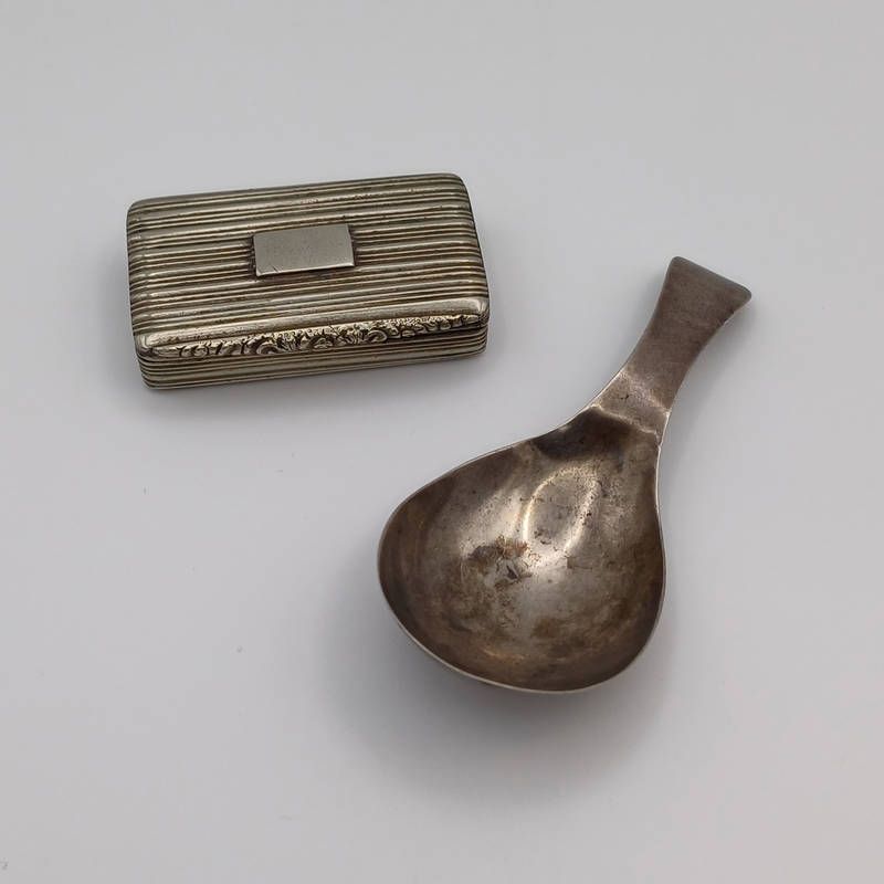 Scottish silver caddy spoon by robert gray, edinburgh circa 1800 & 19th century silver snuff box - damages - 55g total