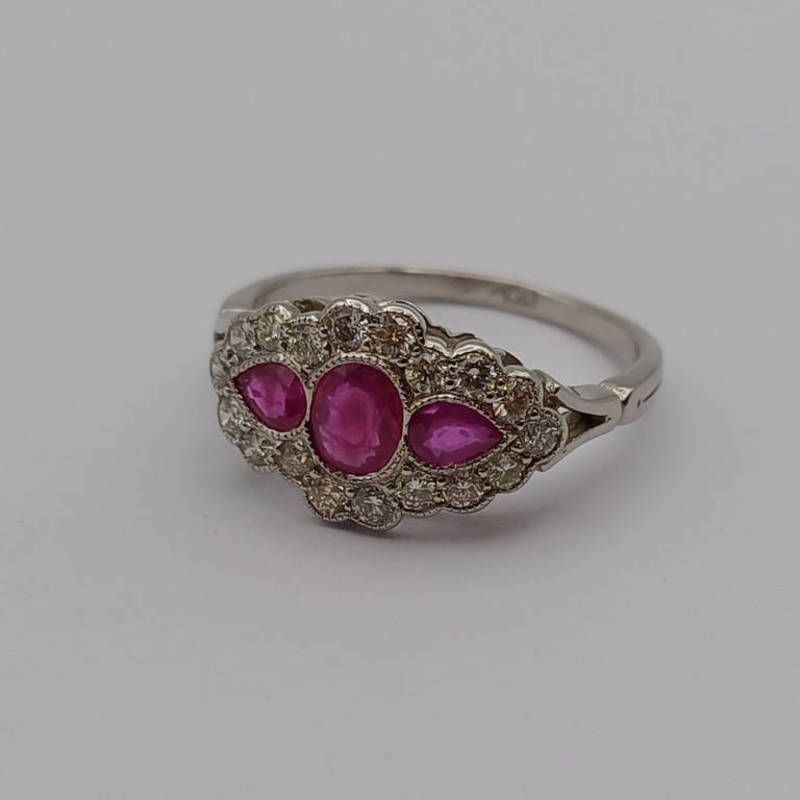 Platinum set ruby & diamond cluster ring, with an oval ruby flanked by 2 pear shaped rubies set within a surround of brilliant cut diamonds - ring size o 1/2