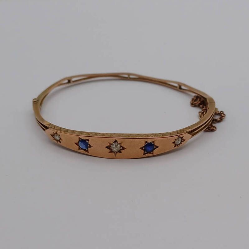 Late 19th century 9ct gold sapphire & diamond hinged bangle 7.1g, 5.8 cm inner diameter
