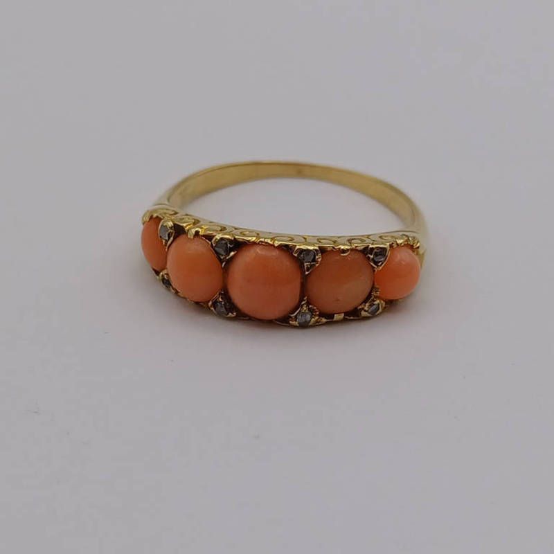 Early 20th century gold coral & diamond set ring, the oval corals set with rose cut diamonds - ring size p