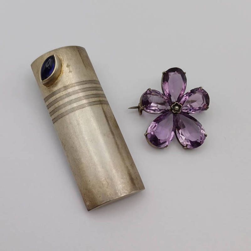 Modernist silver gem set brooch - 6cm long & faceted amethyst & seed pearl flower head brooch