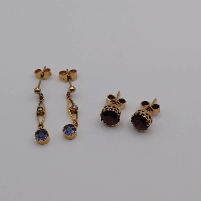 Pair 9ct gold amethyst ear studs & pair gold seed pearl & amethyst earrings - 2.8 g total