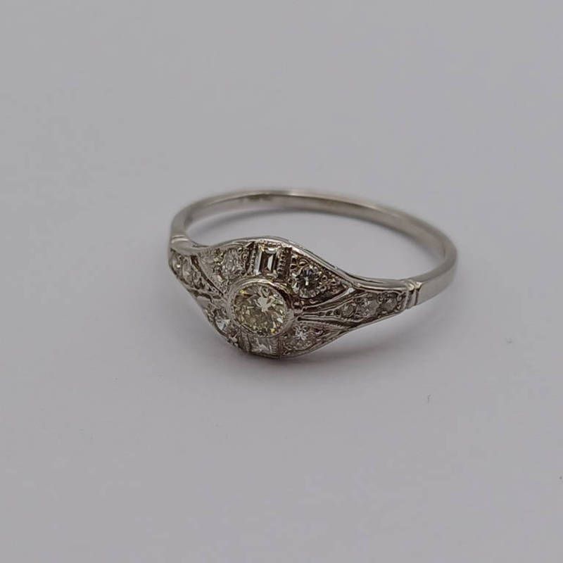 Early 20th century platinum diamond set ring, with brilliant & emerald cut diamonds the principal diamond approx 0.12 carats - ring size o