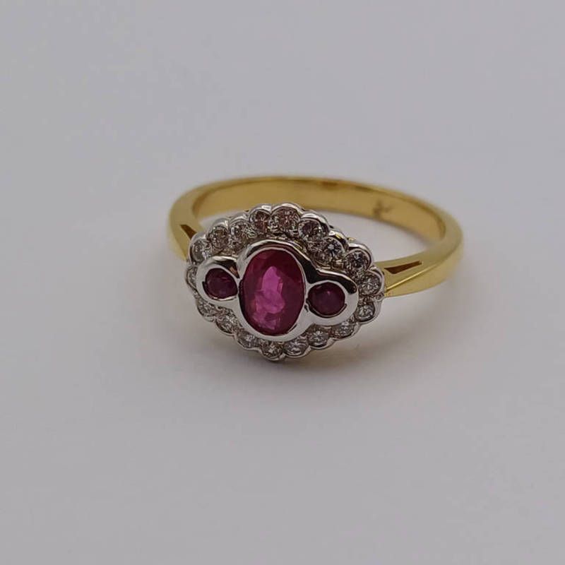 Gold ruby & diamond cluster ring, an oval ruby flanked by 2 circular cut rubies within a surround of brilliant cut diamonds -ring size o 1/2