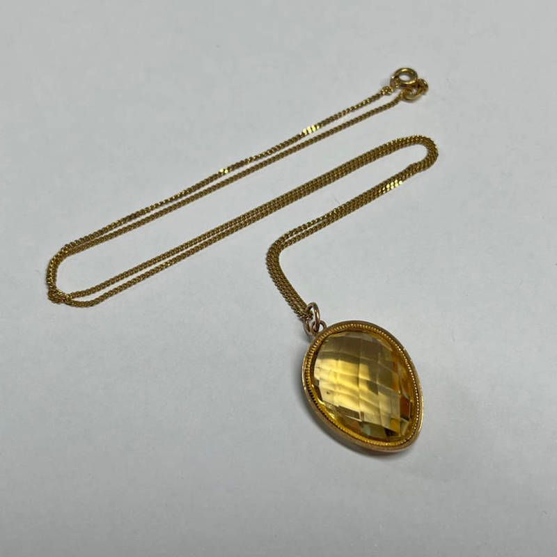 Gold mounted faceted pear shaped citrine pendant on a 9kt gold chain - 8.5 total