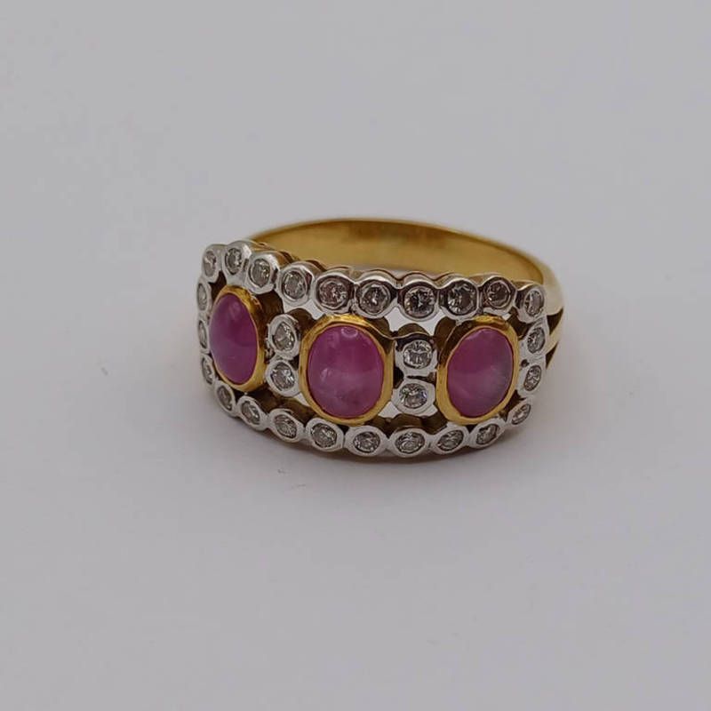 18k pink sapphire & diamond set ring the 3 oval cabochon sapphires set within a surround of brilliant cut diamonds - ring size q, 7.1 g