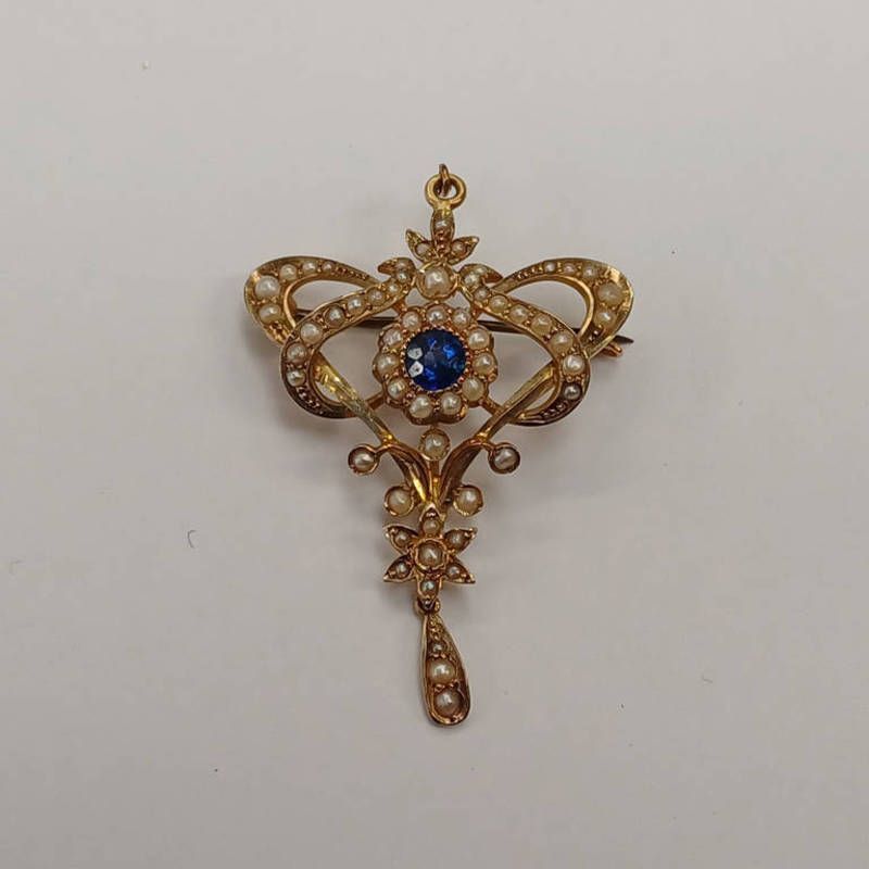 Early 20th century seed pearl & blue paste set brooch pendant - 4.5 cm long, 4.8 g